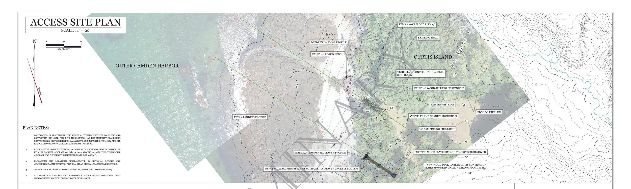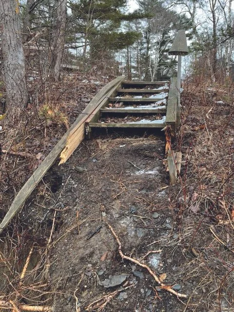 Access In spring 2026, we will redesign and rebuild two access structures damaged during the storms in January 2024. Thanks to a grant from the Maine Lighthouse Trust and support from local engineers at Senders Engineering and fabricators at Rockport Steel, we will create a natural access ramp at the existing landing spot and replace the failing stairs at the kayak landing area. These enhancements will improve access for contractors, volunteers, and small boat visitors to the island.